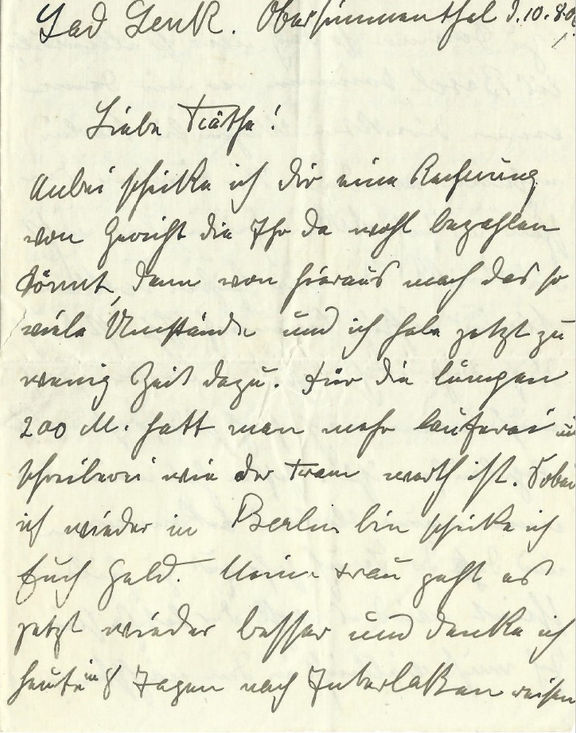Anbei schicke ich dir eine Rechnung von Gericht die Ihr da wohl bezahlen könnt, denn von hieraus macht das so viele Umstände und ich habe jetzt zu wenig Zeit dazu. Für die lumpen 200 M. hat man mehr lauferei und schreiberei wie der Kram werth ist. Sobald ich wieder in Berlin bin, schicke ich Euch Geld. Meiner Frau geht es jetzt wieder besser und denke ich heute in 8 Tagen nach Interlaken reisen zu können so daß wir so allmälich bis Basel komrnen wo wir dann einen direkten Wagen bis Berlin nehmen werden. Wir könnten den schon in Interlaken haben, aber nicht die Strecke die wir fahren wollen. Meine richtige Sommerfrische ist durch diese Sache auch etwas verdorben, doch muß man noch froh sein, daß es so abgelaufen ist. Gestern hat meine Frau einen neuen Verband bekommen und da der Bruch sehr gut zu heilen scheint wird es wohl der Letzte sein. Ich muß vielleicht in den nächsten 4 Wochen nach Karlsruhe um eine Skizze vom Großherzog von Baden zu machen. Ob ich nun erst nach Berlin zurückgehe oder von hier aus direkt nach Karlsruhe gehe. Sollte ich noch vorher nach Berlin gehen da kome ich auf dem Rückweg vielleicht über Sassenberg, aber wie gesagt alles ...
